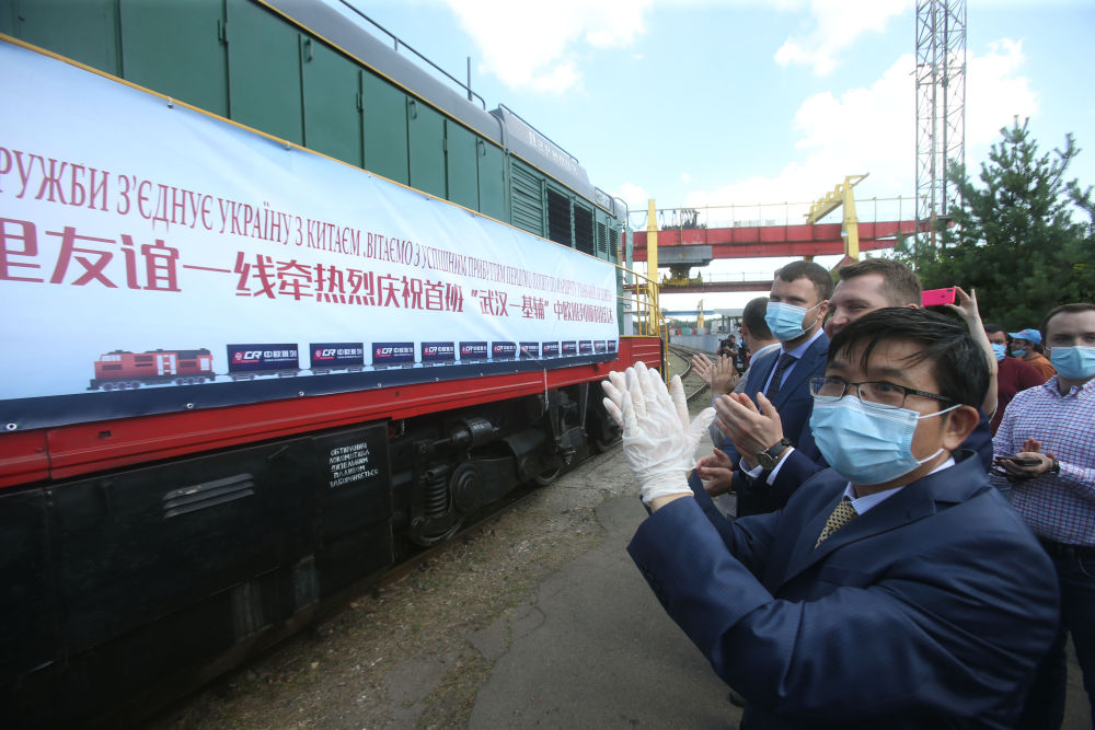 7月6日,在乌克兰首都基辅市利斯基货运站,中乌两国代表迎接“武汉—基辅”中欧班列。(新华社发,谢尔盖·斯塔拉斯坚科摄)